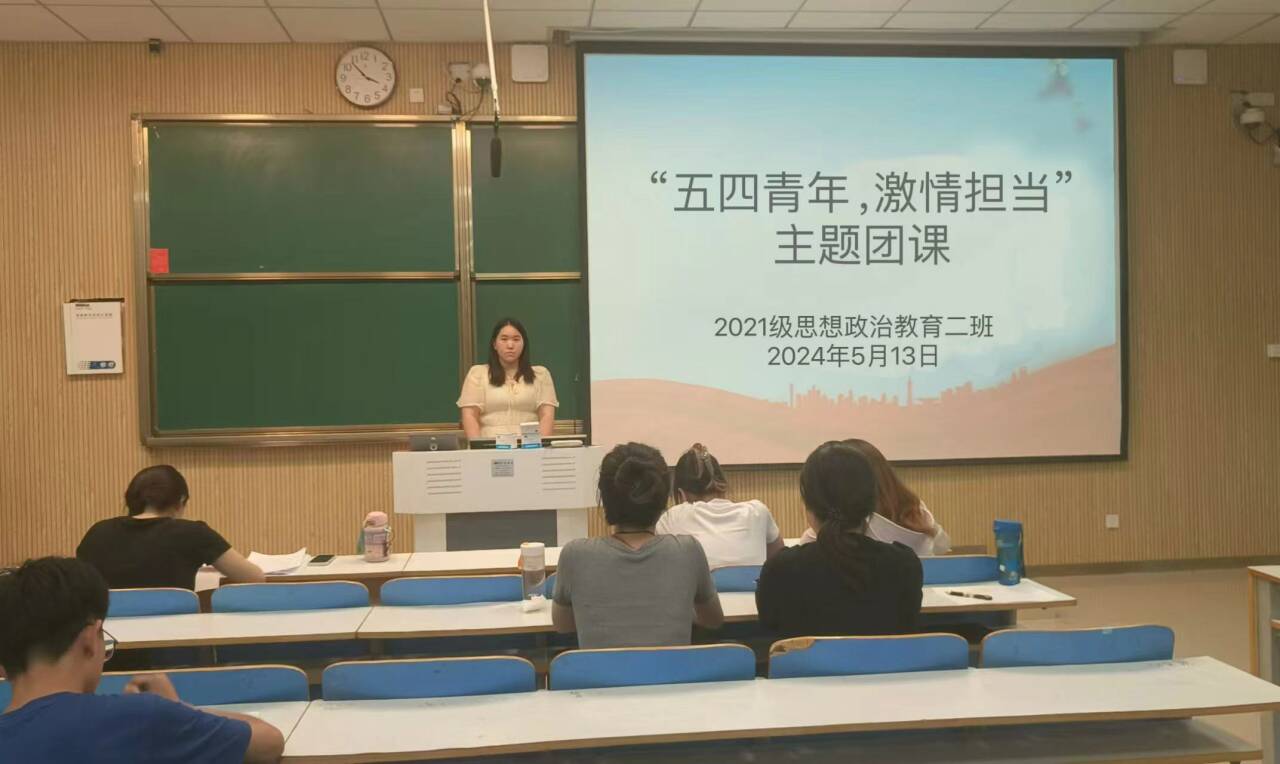 5月13日下午,beat365在线唯一官网2021级思想政治教育二班在社科楼514教室召开“五四青年,激情担当”主题团课。2021级思想政治教育二班全体团员参加此次团课。团课由团支书王婧欣主持。