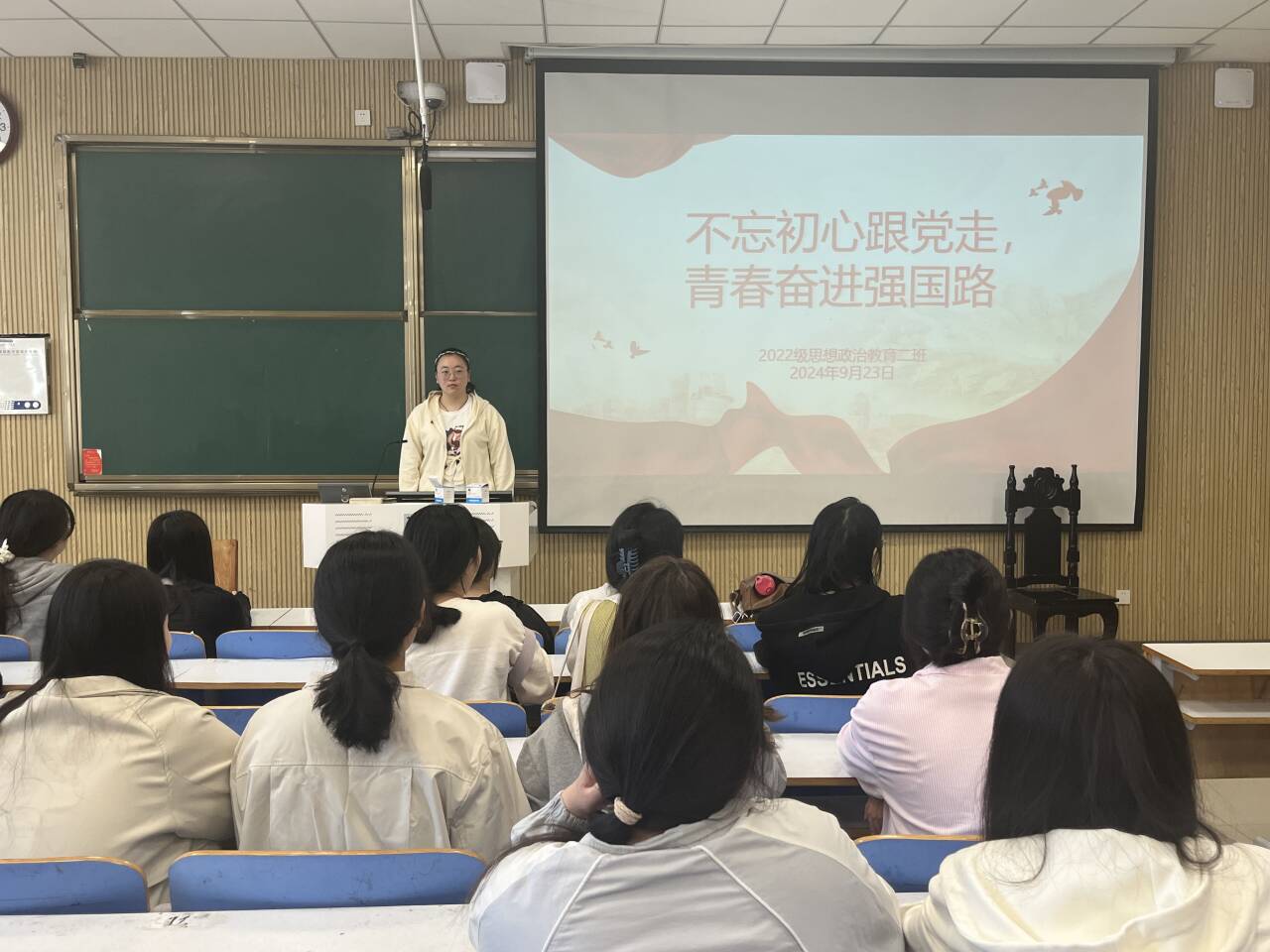 团课在李佳音朗读习近平总书记的青年寄语中开始,强调青年学子们要坚定理想信念,坚定不移听党话、跟党走。随后,李佳音带领同学们回顾与学习党的百年追梦历程以及其中涌现出来的伟大精神,让同学们充分认识到中国共产党的领导是中国特色社会主义制度的最大优势。最后,李佳音指出,青年是国家的未来、民族的希望。同学们应当珍惜青春年华,勇于担当,努力学习科学文化知识,提高自身素质,严格要求自我,为实现国家富强、民族振兴、人民幸福的伟大事业贡献自己的一份力量。