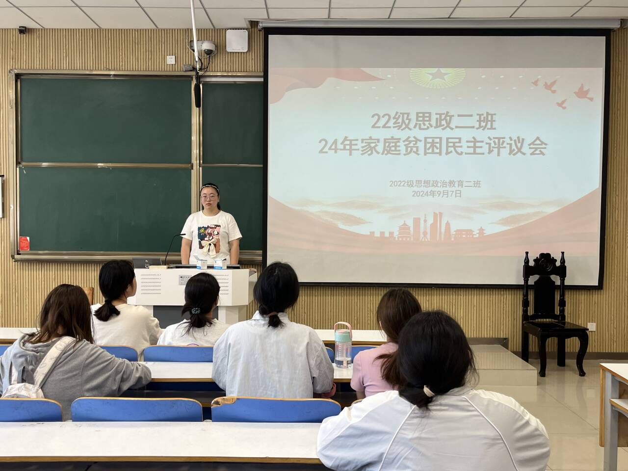9月7日下午,beat365在线唯一官网2022级思想政治教育二班在社科楼514教室召开2024年家庭贫困民主评议会。beat3652022级思想政治教育二班民主评议小组共同参与此次评议会。会议由班长李佳音主持。