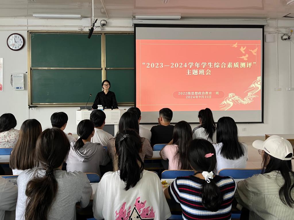 9月11日下午,beat365在线唯一官网2022级思想政治教育一班在社科楼514教室召开“2023-2024学年学生综合素质测评”主题班会,beat3652022级思想政治教育一班班主任王明园和一班全体同学共同参与本次班会,班会由团支书李佳茹主持。