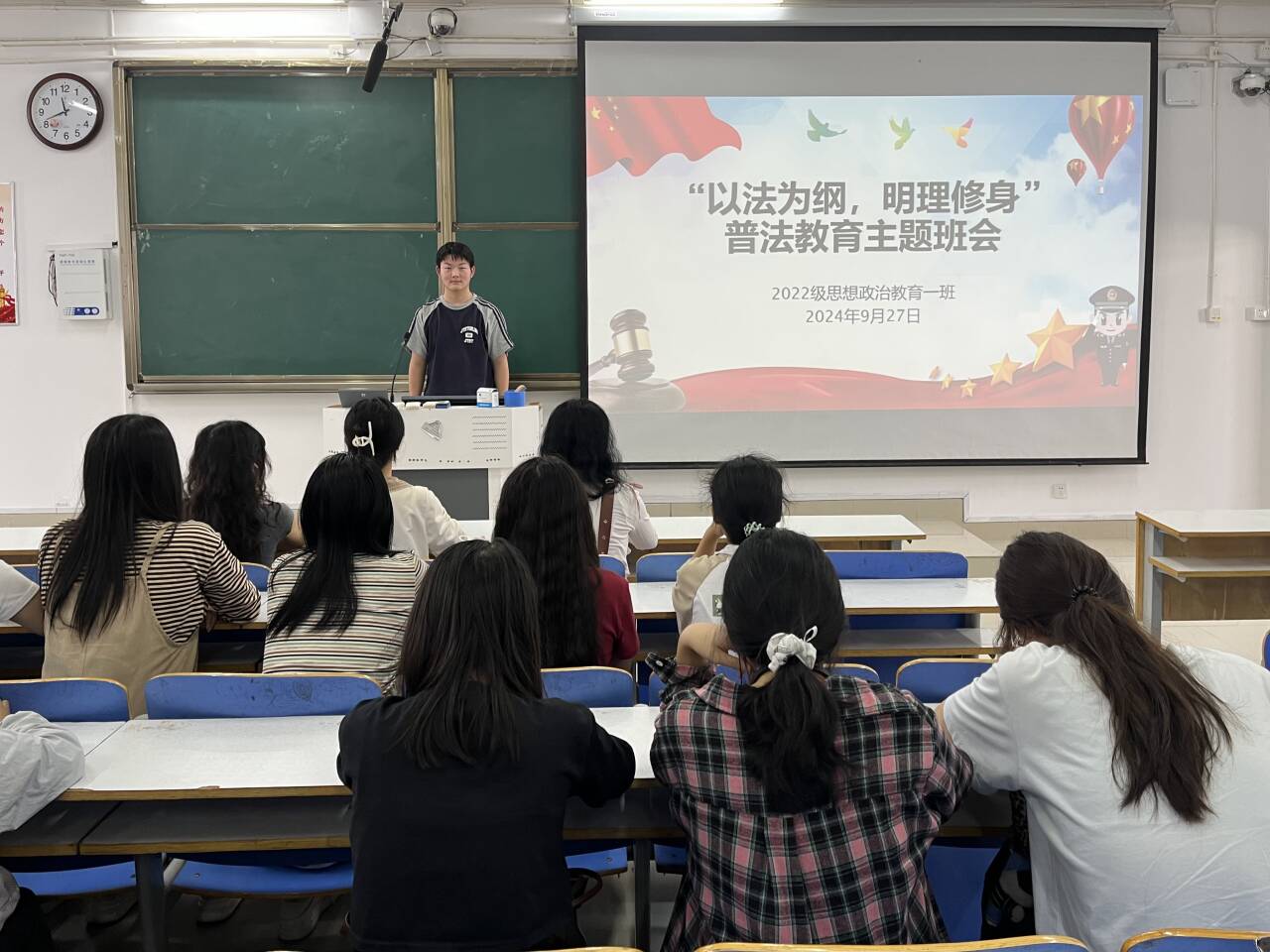 为深入贯彻习近平法治思想,培养学生的法治观念,9月27日上午,beat365在线唯一官网2022级思想政治教育一班在社科楼514教室召开“以法为纲,明理修身”普法教育主题班会,beat3652022级思想政治教育一班全体同学共同参与本次班会,班会由副班长闻炎仲主持。