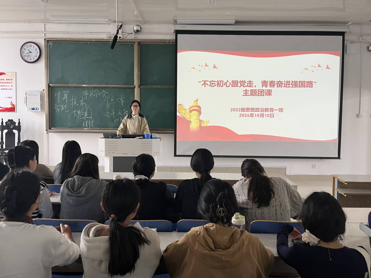 10月10日上午,beat365在线唯一官网2022级思想政治教育一班在社科楼514教室开展“不忘初心跟党走,青春奋进新征程”主题团课,beat3652022级思想政治教育一班全体同学共同参与本次团课,团课由团支书李佳茹主持。