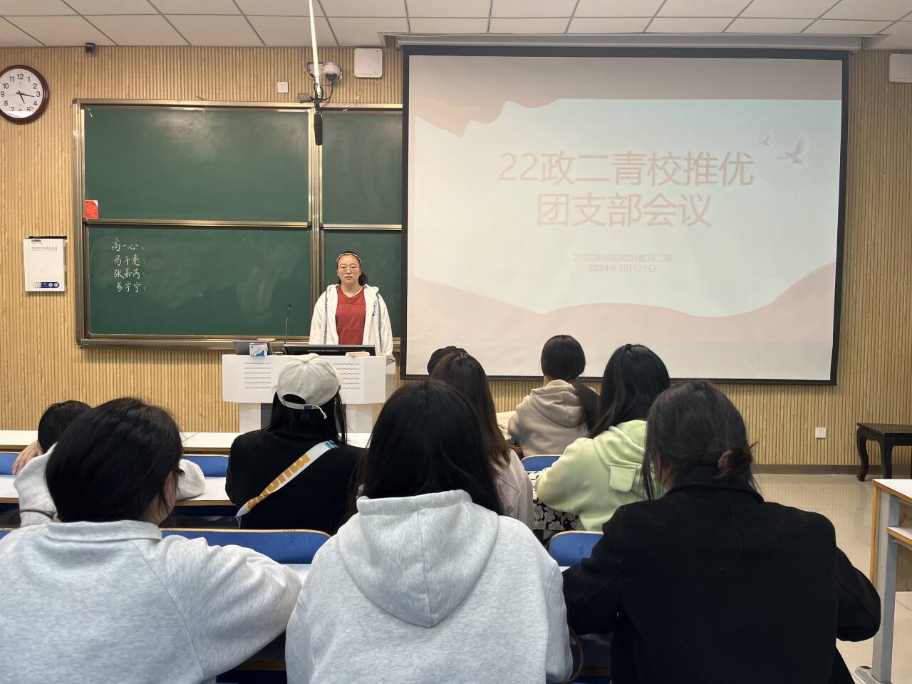 10月21日下午,beat365在线唯一官网2022级思想政治教育二班在社科楼515教室召开青校推优团支部会议。beat3652022级思想政治教育二班全体成员共同参与此次班会。会议由班长李佳音主持。