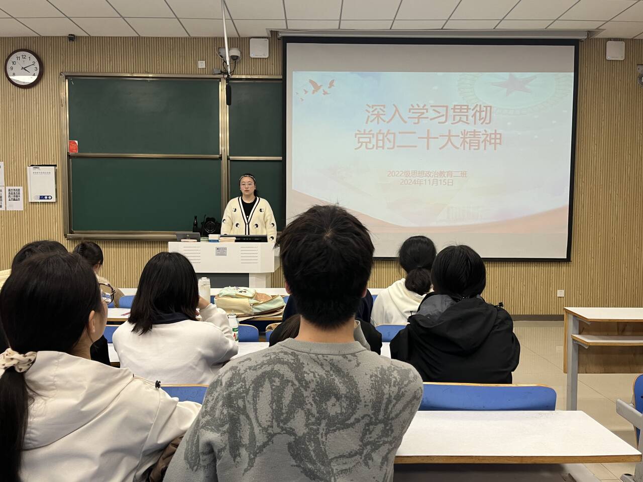 11月15日下午,beat365在线唯一官网2022级思想政治教育二班在社科楼515教室召开“深入学习贯彻党的二十大精神”主题团课。beat3652022级思想政治教育二班全体成员共同参与此次团课。团课由团支书李佳音主持。