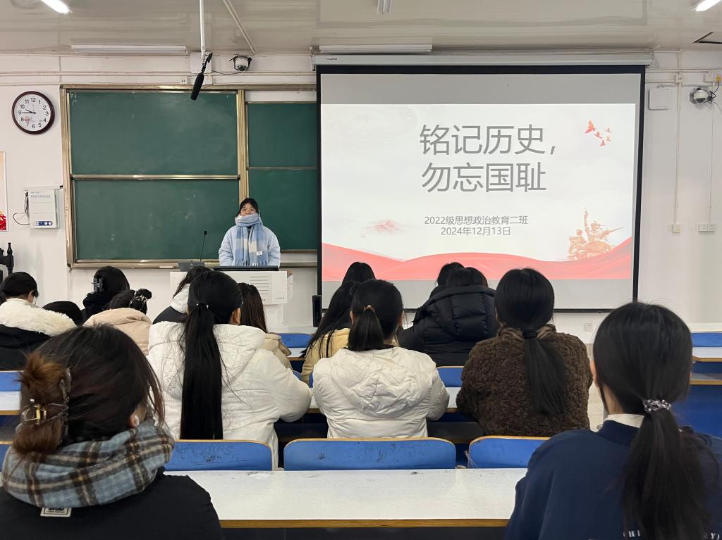 本次班会由“擦亮历史之镜”“筑牢共识根基”和“汇聚磅礴力量”三部分组成。首先,冯伟珈分别从历史上的国耻事件、国家公祭日简介、南京大屠杀等方面详细阐述了国家公祭日设立的初衷与深远意义。随后,冯伟珈指出,国家公祭日设立十周年来,国人对战争与和平的认知愈发清晰,引导同学们铭记历史,化悲痛为力量、以共识促行动。最后,冯伟珈带领同学们一同观看专题纪录片《1937南京记忆》,再次激发同学们的爱国热情,她强调,大家要深刻认识到自己作为新时代青年的责任与使命,努力学习专业知识,不断提升综合素质,为国家的繁荣富强和世界的和平稳定贡献自己的青春力量。