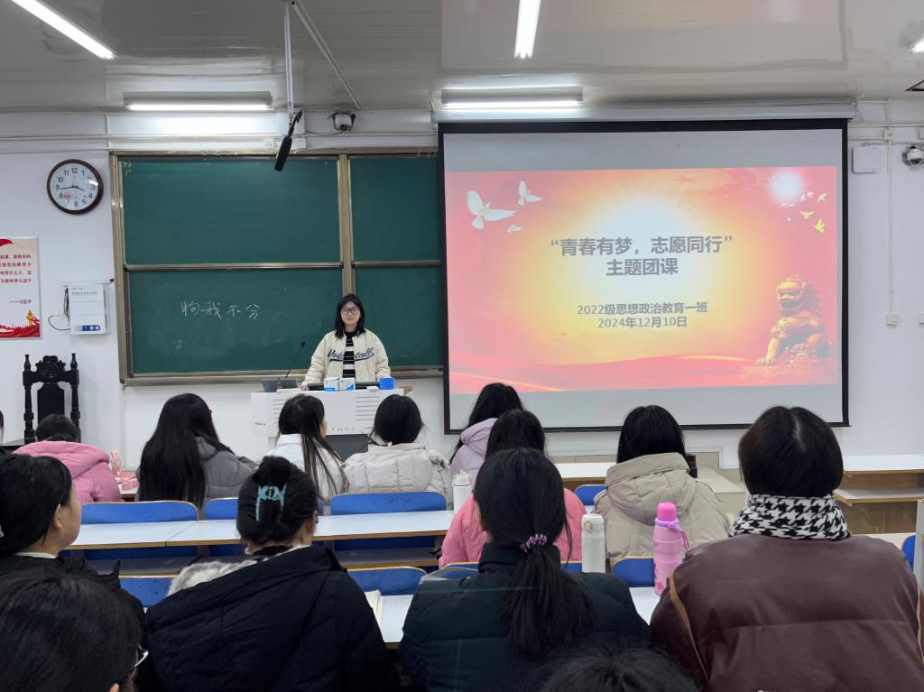 12月10日下午,beat365在线唯一官网2022级思想政治教育一班在社科楼514教室召开“青春有梦,志愿同行”主题团课,beat3652022级思想政治教育一班全体同学共同参与本次团课,团课由团支书李佳茹主持。
