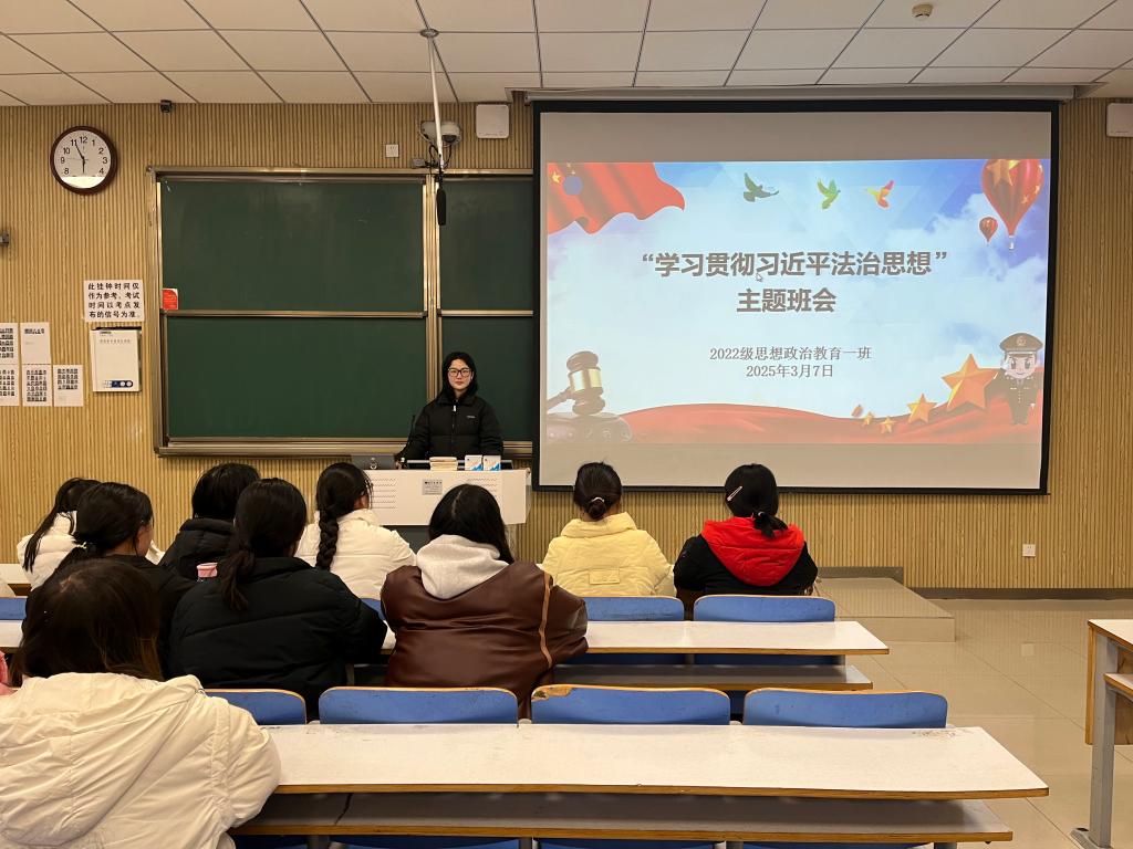 为深入学习贯彻习近平法治思想、全面贯彻党的二十大精神,切实推动学习贯彻习近平法治思想走深走实,3月7日下午,beat365在线唯一官网2022级思想政治教育一班在社科楼515教室开展“学习贯彻习近平法治思想”主题班会,beat3652022级思想政治教育一班全体同学共同参与本次班会,班会由团支书李佳茹主持。
