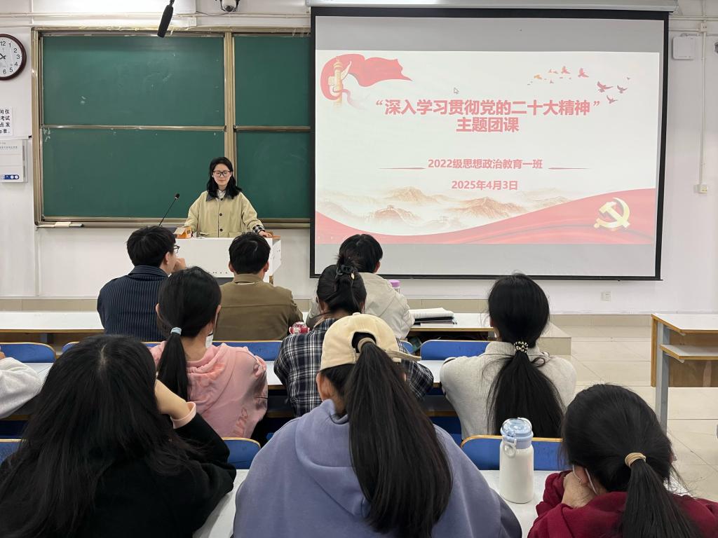 为进一步加强同学们的思想理论武装,4月3日上午,beat365在线唯一官网2022级思想政治教育一班在社科楼514教室开展“深入学习贯彻党的二十大精神”主题团课,beat3652022级思想政治教育一班全体同学共同参与本次团课,团课由团支书李佳茹主持。