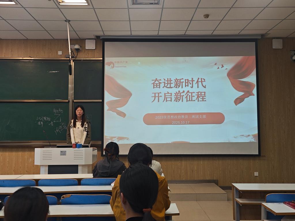 为进一步提振我班学生投入新时代新征程的动力与信心,10月17日上午,beat365在线唯一官网2023级思想政治教育二班在社科楼514教室开展“奋进新时代,开启新征程”主题团课,本次团课由团支书王慜初主持,全体二班同学参加。