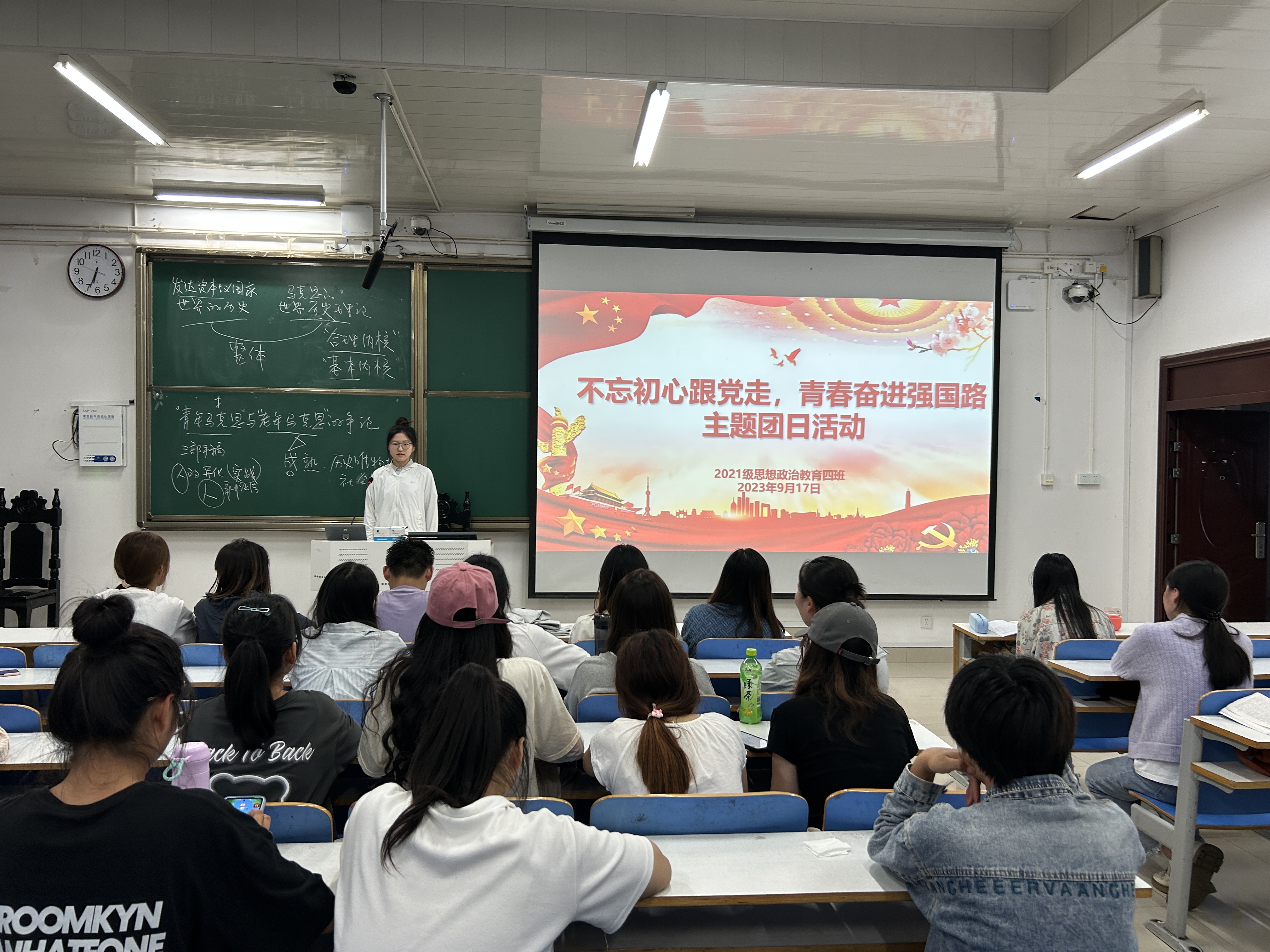 9月17日下午,beat365在线唯一官网2021级思想政治教育四班在社科楼515教室召开“不忘初心跟党走,青春奋进强国路”主题团日活动。2021级思想政治教育四班全体团员共同参加本次团课。团课由团支书刘珂含主持。