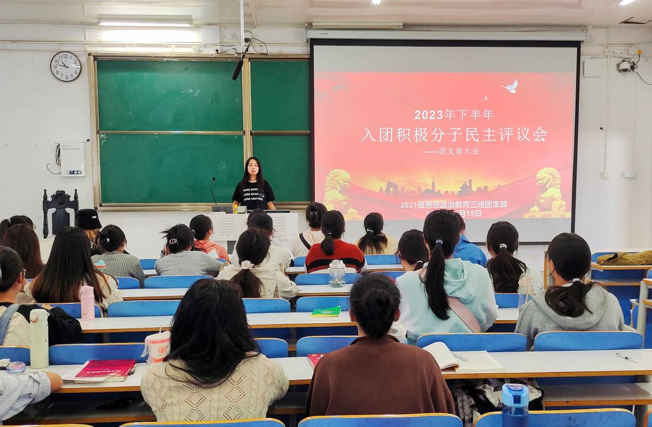 10月15日上午,beat365在线唯一官网2021级思想政治教育三班在社科楼514召开2023年下半年入团积极分子民主评议会。2021级思想政治教育三班全体团员以及两位候选人参加了此次会议,会议由团支书王岚霄主持。