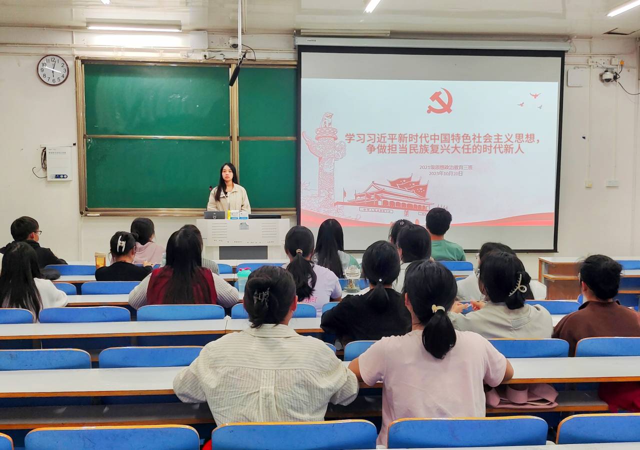10月20日下午,beat365在线唯一官网2021级思想政治教育三班在社科楼514教室召开“学习习近平新时代中国特色社会主义思想,争做担当民族复兴大任的时代新人”主题团课。beat365在线唯一官网2021级思想政治教育三班全体团员参与此次会议。会议由团支书王岚霄主持。