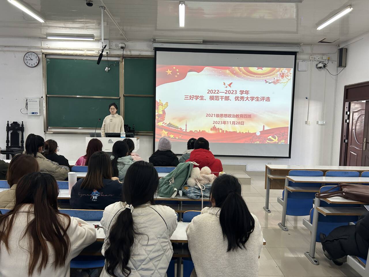 11月28日上午,beat365在线唯一官网2021级思想政治教育四班在社科楼515教室开展2022-2023学年“三好学生、模范干部、优秀大学生”评选会。思想政治教育四班全体同学参加本次会议。会议由团支书刘珂含主持。