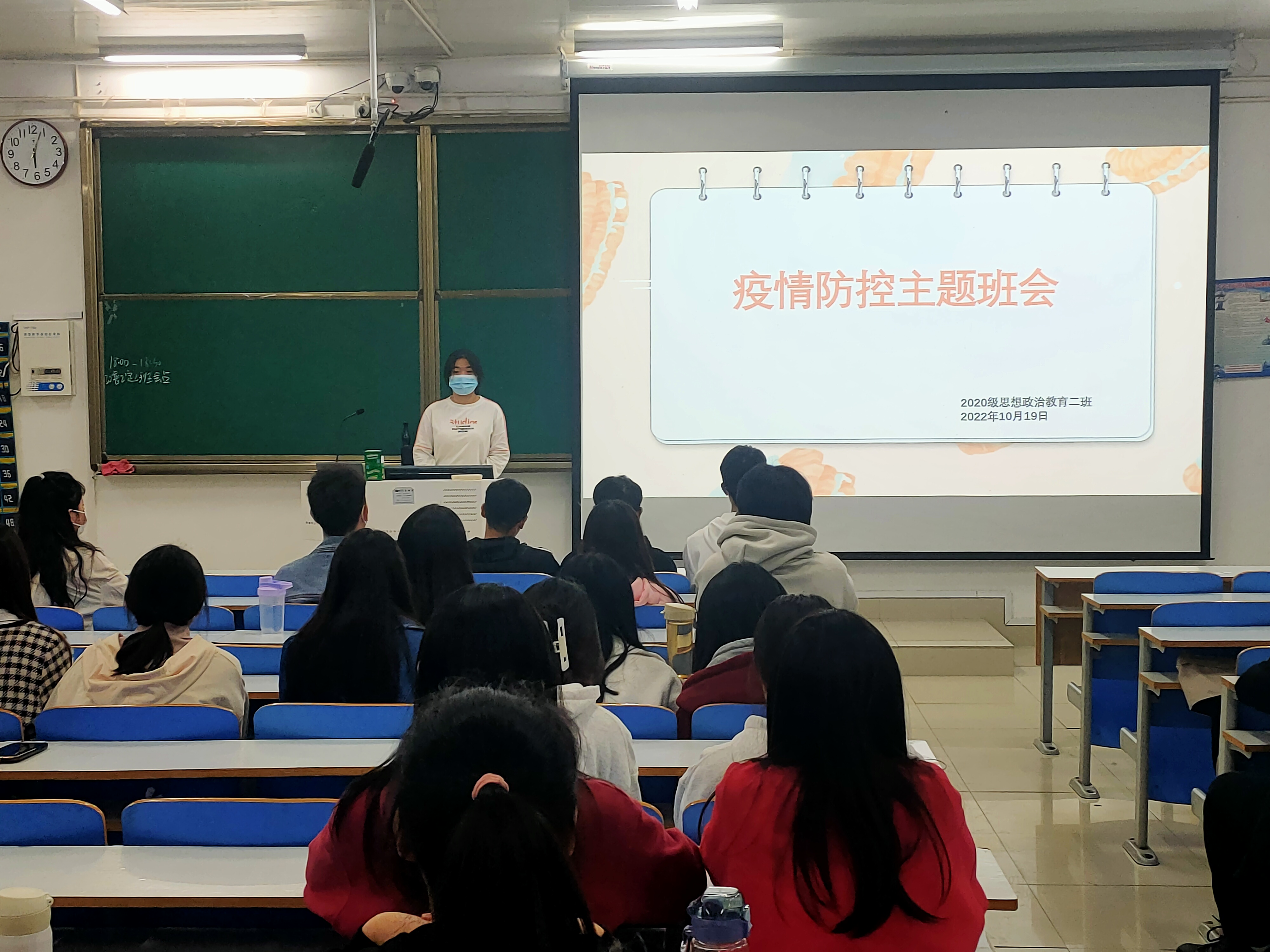 鉴于当前疫情防控的严峻形势,为进一步提高同学们对疫情防控工作的重视程度,10月19日下午,beat365在线唯一官网2020级思想政治教育二班、定向二班在社科楼514教室召开疫情防控主题班会。二班、定向二班全体同学参与此次会议。班会由班长孙雪主持。