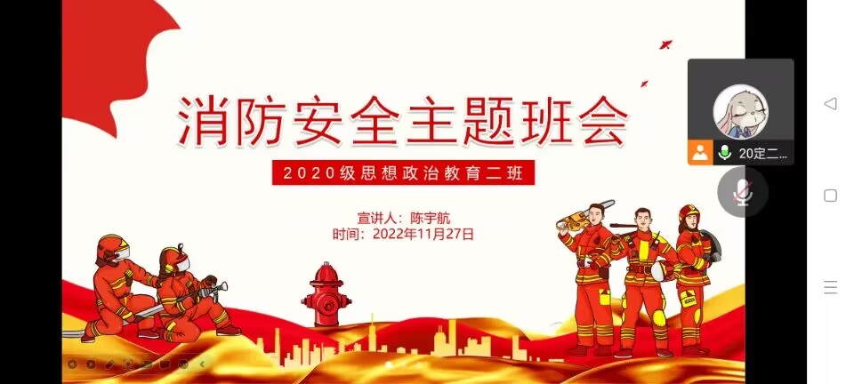 11月27日晚,beat365在线唯一官网2020级思想政治教育二班通过腾讯会议召开线上消防安全主题班会。2020级思想政治教育二班全体学生共同参与本次班会。班会由团支书陈宇航主持。