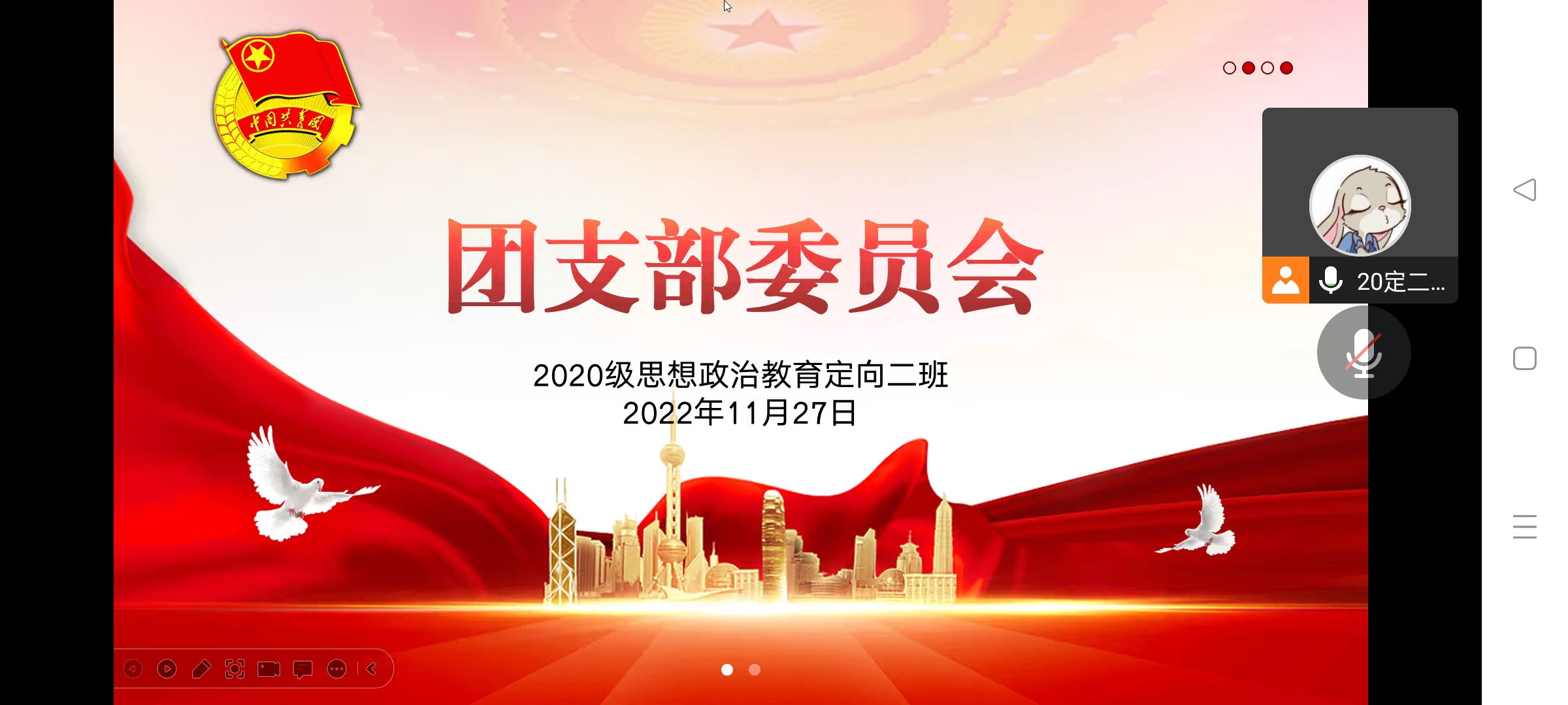 11月27日晚上,beat365在线唯一官网2020级思想政治教育定向二班通过腾讯会议召开班委工作线上述职会。定向二班全体班委准时参会。会议由团支书李晨曦主持。