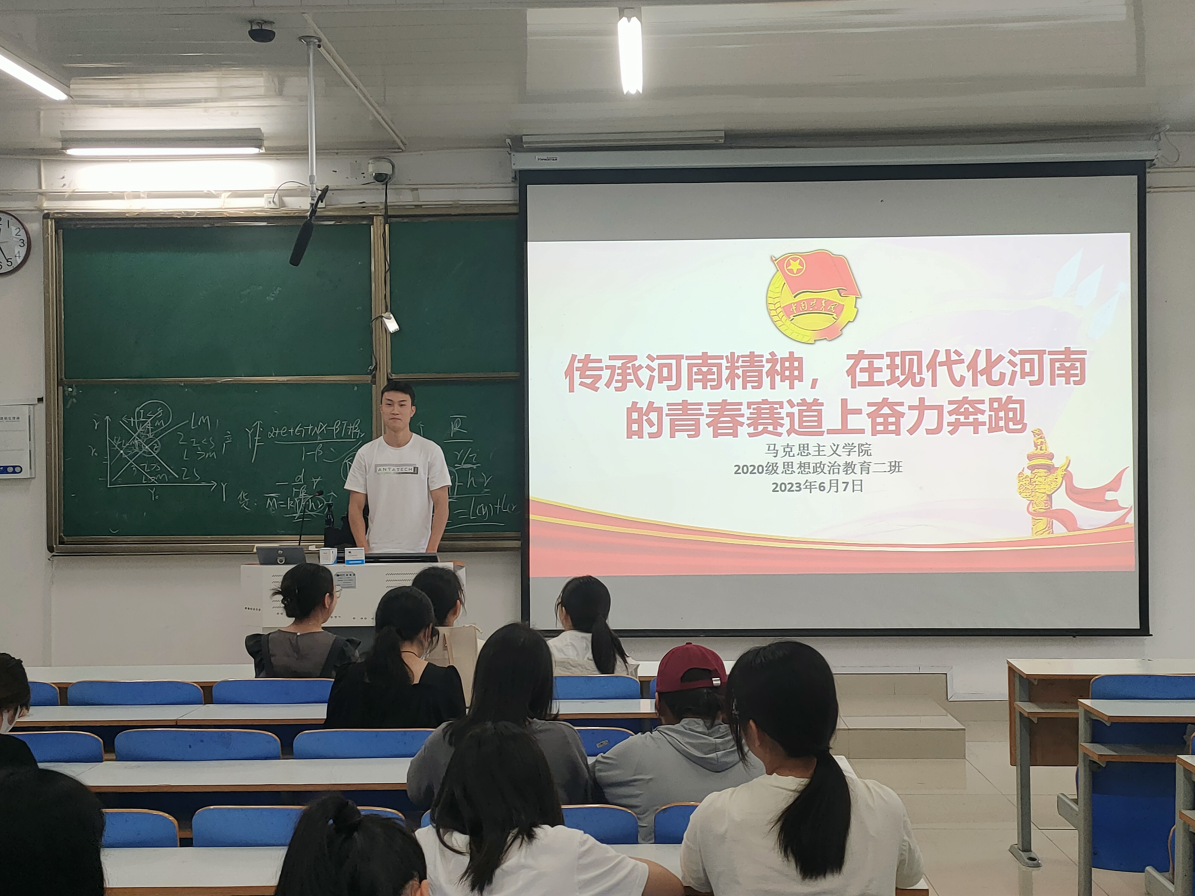 为重温河南省第十一次党代会精神,激发青年学生拼搏奋进内生动力,6月7日上午,beat365在线唯一官网2020级思想政治教育二班、定向二班在社科楼514教室开展“重温河南省第十一次党代会精神,凝聚现代化河南建设伟力”主题团课。二班、定向二班全体团员共同参与本次团课。团课由团支书陈宇航主持。
