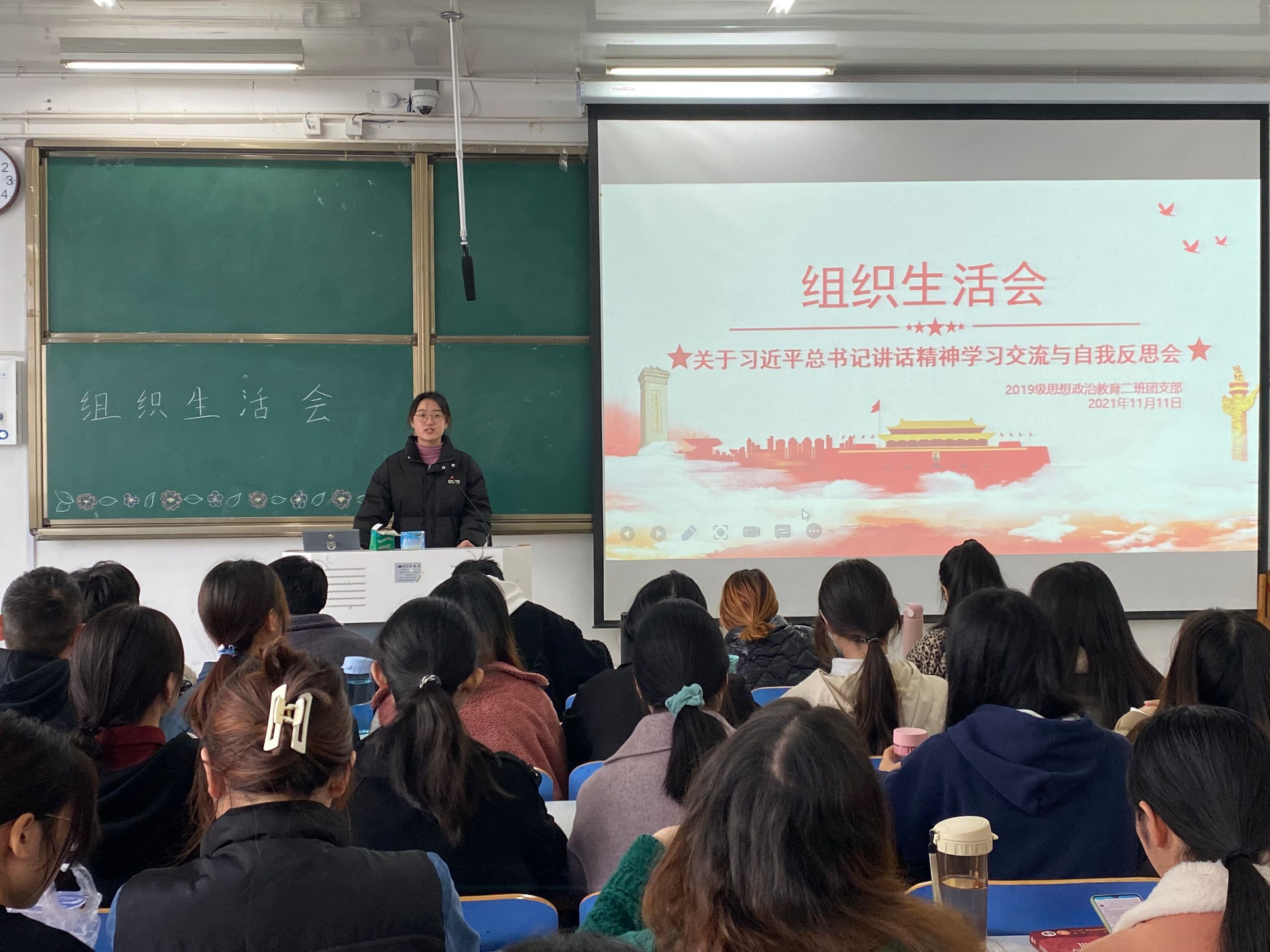 为贯彻落实全团“学党史、强信念、跟党走”学习教育部署,强化广大团员的使命担当,11月11日上午,beat3652019级思想政治教育二班于社科楼516教室召开关于习近平总书记讲话精神学习交流与自我反思专题组织生活会。2019级思想政治教育二班辅导员陶青青以及全体学生共同参会。会议由团支书孙雅娴主持。