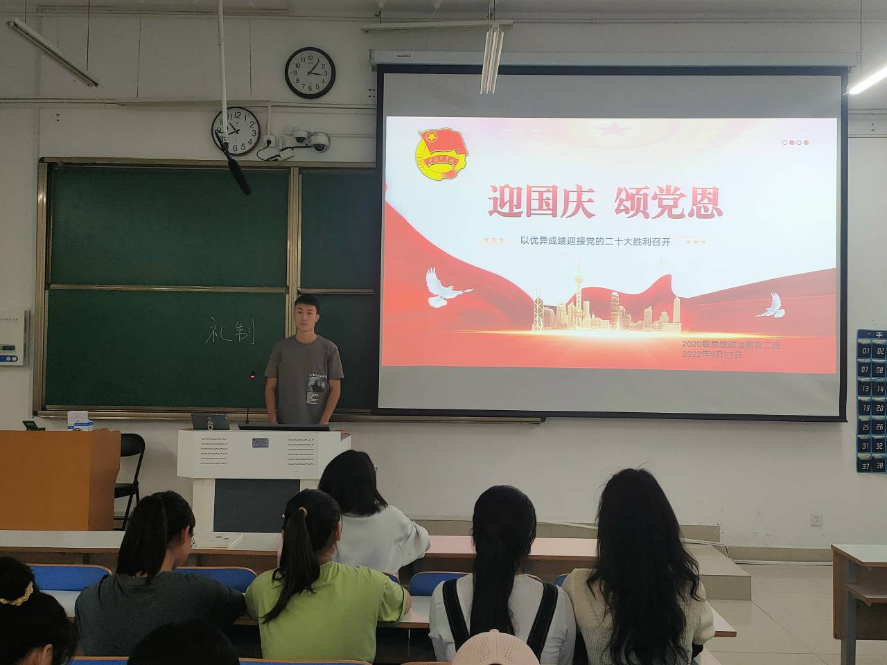 为深入回顾党和国家走过的光辉历程,促使我班团员以昂扬的姿态喜迎国庆和党的二十大,9月28日下午,beat365在线唯一官网2020级思想政治教育二班、定向二班在社科楼415教室开展“迎国庆,颂党恩”主题团课。二班、定向二班全体团员共同参与本次团课。团课由团支书陈宇航主持。