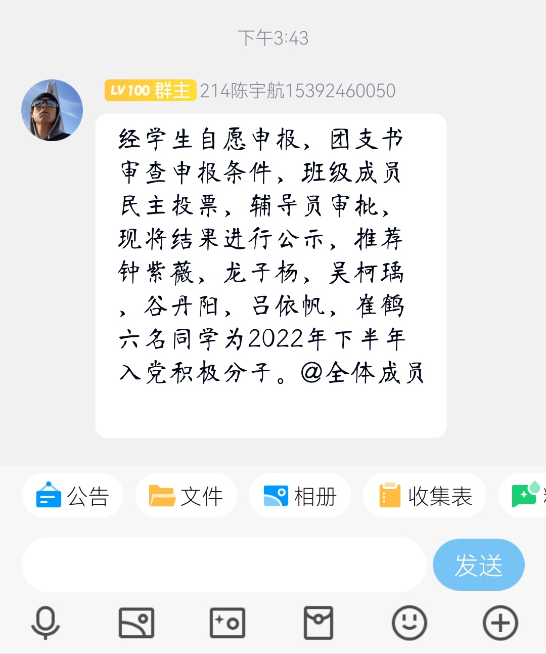 会议伊始,陈宇航宣读beat365关于开展入党积极分子推优工作的通知要求,并对会议流程及投票表决规则作出说明。接着,我班入党积极分子候选人依次从学习、思想、工作等方面进行自述,为投票表决提供参考。随后,陈宇航在班级管理群内发起投票,我班团员严格遵照表决规则公平有序投票。最后,陈宇航将表决结果向全体团员公示,表决结果截图存档。本次推优会议在我班全体团员的全程参与和监督下顺利结束。