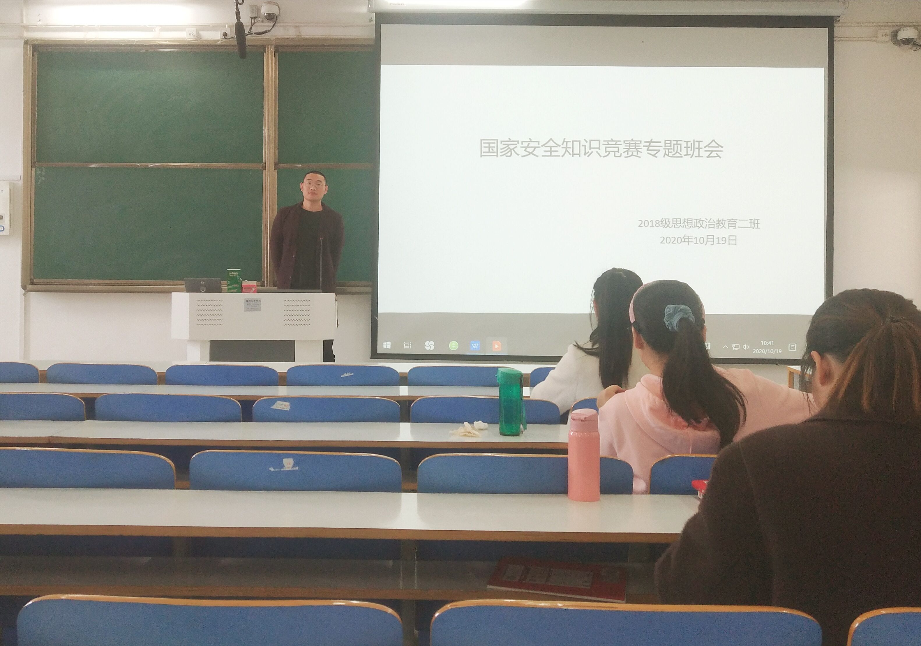 10月19日上午,beat3652018级思想政治教育二班在社科楼514教室顺利开展“国防安全知识竞赛”专题班会。2018级思想政治教育二班全体成员共同参加了此次班会。会议由班长杨康主持。