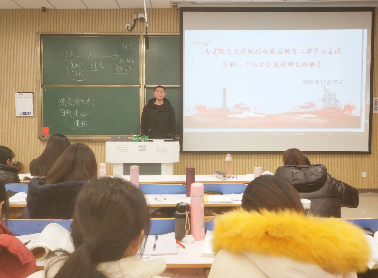11月25日上午,beat365在线唯一官网2018级思想政治教育二班在社科楼515教室顺利开展学习中华全国学生联合会第二十七次代表大会精神主题班会。会议由班长杨康主持。