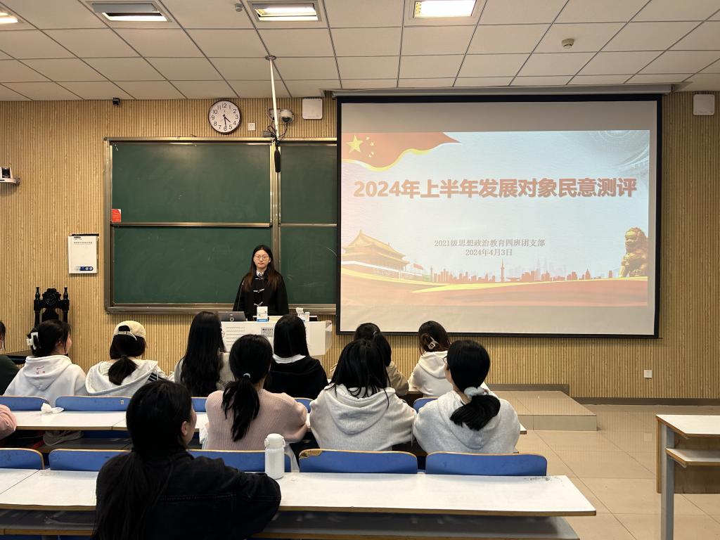 4月3日下午,beat365在线唯一官网2021级思想政治教育四班在社科楼514教室召开2024年发展对象民意测评。2021级思想政治教育四班全体团员共同参会。会议由团支书刘珂含主持。