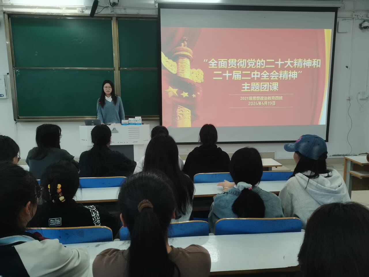 为深入贯彻学习党的二十大精神,4月19日下午,beat365在线唯一官网2021级思想政治教育四班在社科楼514教室开展“全面贯彻党的二十大精神和二十届二中全会精神”主题团课。2021级思想政治教育四班全体团员参加本次团课。团课由团支书刘珂含主持。