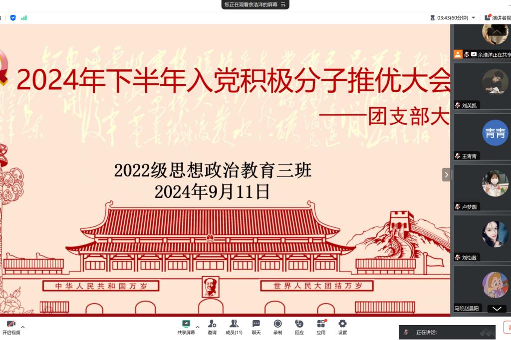 9月11日晚,beat365在线唯一官网2022级思想政治教育三班在线上腾讯会议召开入党积极分子推优大会。beat3652022级思想政治教育三班班主任任婷与班级全体团员共同参加此次大会。大会由团支书余浩洋主持。