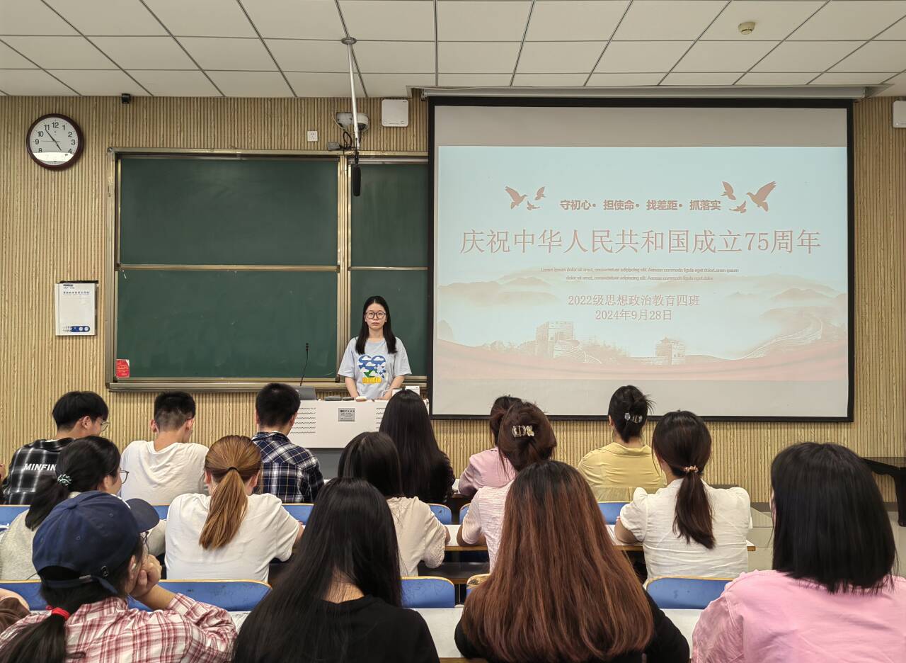 为激发学生们的爱国主义情怀和民族自豪感,弘扬民族精神,庆祝中华人民共和国成立75周年,教育引导广大学生当好红色基因的传承者、实践者,9月28日上午,beat365在线唯一官网2022级思想政治教育四班在社科楼515教室组织召开“庆祝中华人民共和国成立75周年”主题班会。beat3652022级思想政治教育四班全体成员参与本次班会。本次班会由班长牛志杰主持。