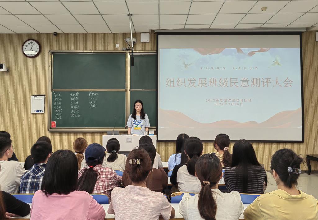 9月28日下午,beat365在线唯一官网2022级思想政治教育四班在社科楼515教室组织召开“组织发展班级民意测评大会”。beat3652022级思想政治教育四班全体成员参与本次大会。本次大会由团支书牛志杰主持。