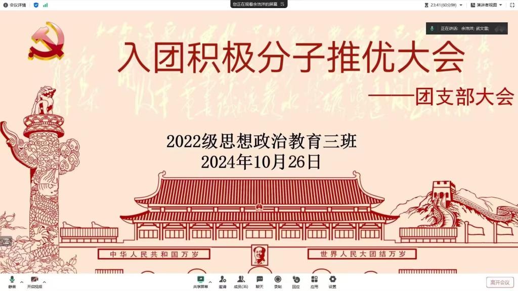 10月26日上午,beat365在线唯一官网2022级思想政治教育三班在线上腾讯会议召开2024年下半年入团推优大会。beat3652022级思想政治教育三班全体同学共同参与此次大会。大会由团支书余浩洋主持。