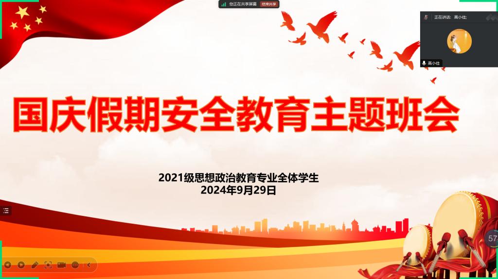 9月29日下午,beat365在线唯一官网2021级思想政治教育一班、二班在腾讯会议召开“国庆假期安全教育”主题班会。辅导员高小佳及全体成员共同参加,班会由辅导员高小佳主持。