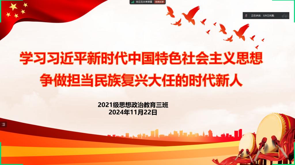 11月22日下午,beat365在线唯一官网2021级思想政治教育三班在线上召开“学习习近平新时代中国特色社会主义思想,争做担当民族复兴大任的时代新人”主题团课。beat365在线唯一官网2021级思想政治教育三班全体团员参与此次会议。会议由团支书王岚霄主持。