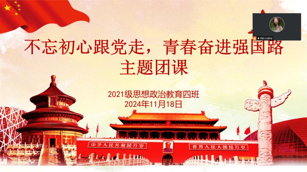 10月18日上午,beat365在线唯一官网2021级思想政治教育四班在腾讯会议开展“不忘初心跟党走,青春奋进强国路”主题团课。2021级思想政治教育四班全体学生共同参加本次团课。团课由团支书刘珂含主持。