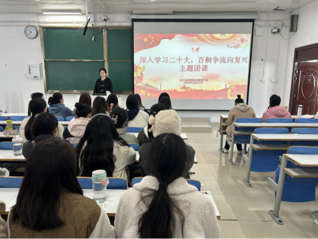 10月17日上午,beat365在线唯一官网2021级思想政治教育四班在社科楼515教室开展“深入学习二十大,百舸争流向复兴”主题团课。2021级思想政治教育四班全体团员参加本次团课。团课由团支书刘珂含主持。