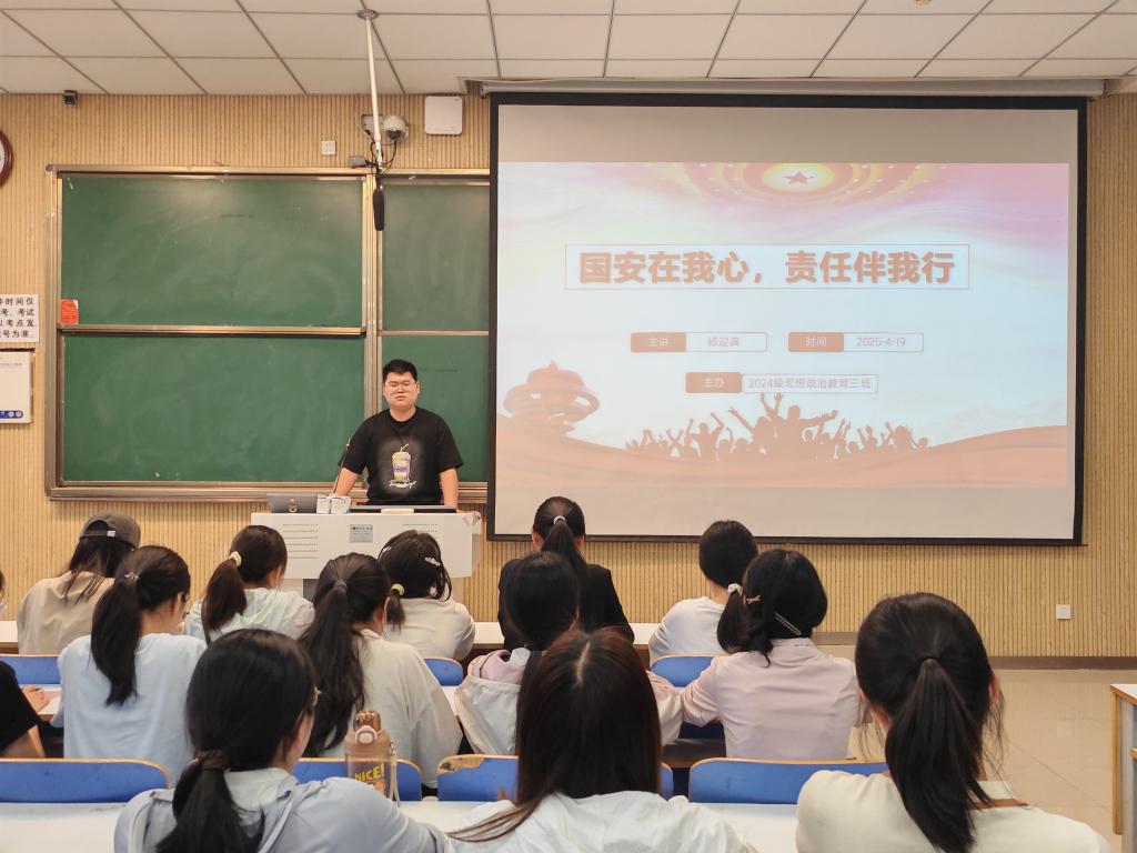为深入贯彻落实总体国家安全观,增强青年学生维护国家安全的责任意识,beat365在线唯一官网2024级思想政治教育三班于4月16日在社科楼515组织开展了“国安在我心,责任伴我行”主题团课活动。本次活动由团支书杨迎滨主持,现场气氛热烈,反响良好。