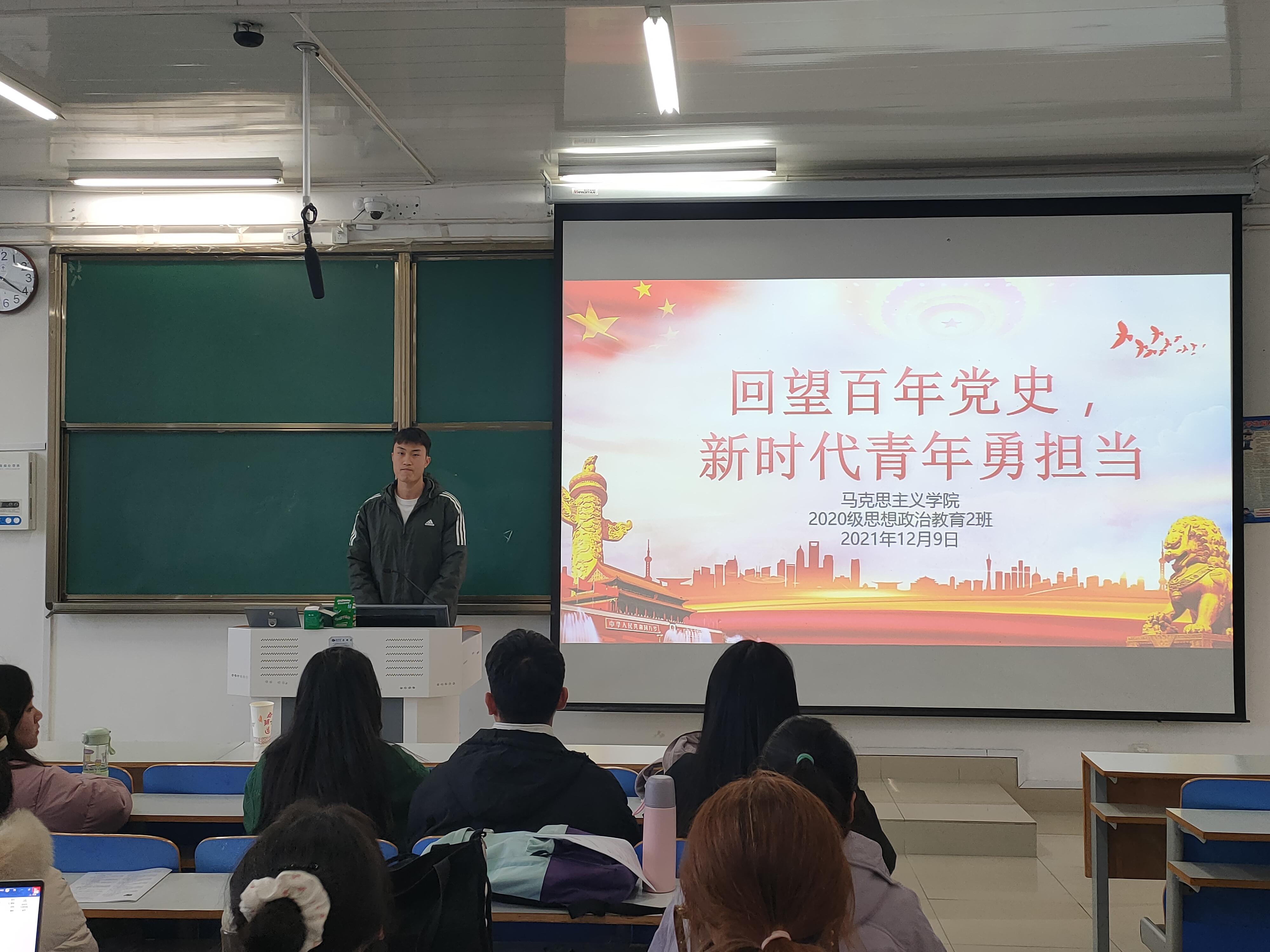 12月9日下午,beat365在线唯一官网2020级思想政治教育二班、定向二班在社科楼514教室开展“回望百年党史,新时代青年勇担当”主题团课。2020级思想政治教育二班、定向二班全体团员共同参与本次团课。团课由团支书陈宇航讲授。